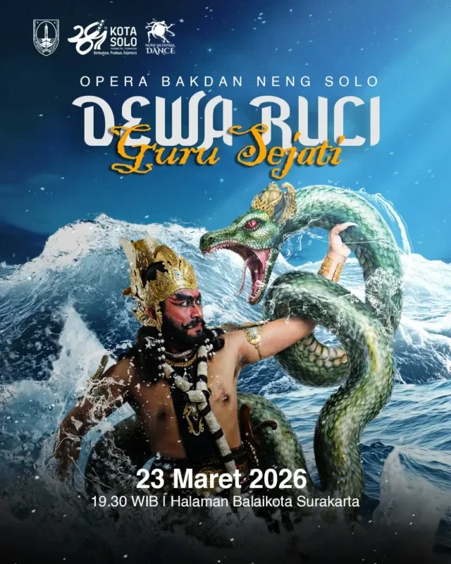 TIMLO.ID – Kota Surakarta kembali menghadirkan pertunjukan seni budaya melalui Opera Bakdan Neng Solo bertajuk “Dewa Ruci: Guru Sejati.” Pertunjukan ini akan digelar pada Senin, 23 Maret 2026 pukul 19.30 WIB di Halaman Balaikota Surakarta dan terbuka untuk umum serta gratis.