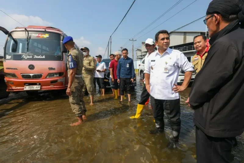 TIMLO.ID – Wakil Gubernur Jawa Tengah, Taj Yasin, melakukan peninjauan langsung ke lokasi banjir rob yang melanda Jalan Raya Pantura di Kecamatan Sayung, Kabupaten Demak, pada Rabu (28/5/2025). Banjir rob tersebut menyebabkan terganggunya aktivitas lalu lintas, baik bagi masyarakat maupun industri di sekitar wilayah tersebut.